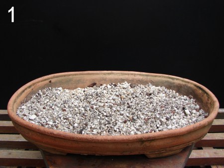 Vaso com tela no fundo, três perfurações de saída de água. Cama de substrato base.