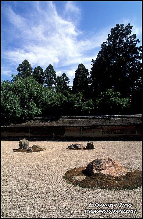 Ryoan-ji templo possui aquilo que é provavelmente a mais famosa da seca jardins Zen Budista – quinze pedras dispostas em um retângulo branco de raked cascalho. Embora originalmente criada no século XV, a sua forma actual maio remontam apenas à tarde ou no início do décimo oitavo século XIX.