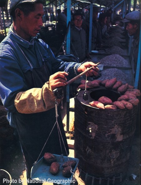 Comerciante em um mercado livre, cozinhando batatas em um forno feito em um tambor de óleo. Está usando um peso único e tradicional da região.