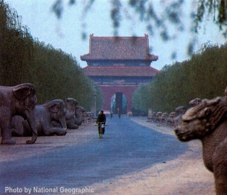 Ciclista passa por 24 esculturas de animais feitas em pedra, que guardam a Estrada Espiritual a caminho do vale das Tumbas Ming.