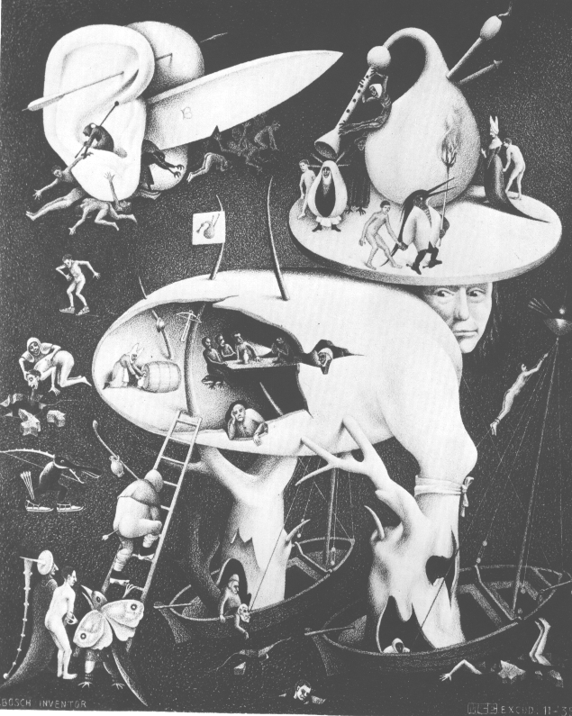 Fazendo uma correção, este quadro atribuído ao M.C.Escher é do pintor medieval Hieronimus Bosh (1450/1516). Faz parte de um tríptico intitulado, The Garden of Earthly Delights (Jardins das Delícias Terrenas), pintado em 1504.