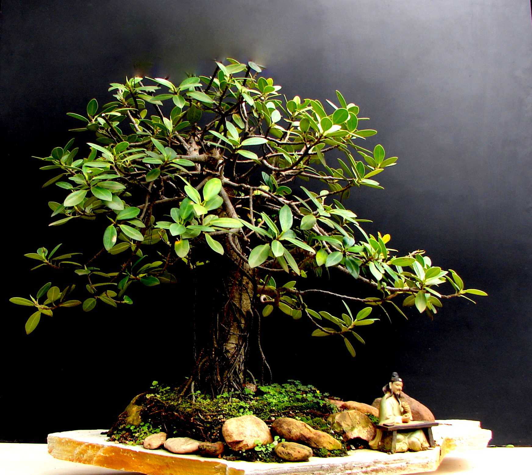 Acima Ficus Retusa plantado em pedra São Tomé. Penjing Aido Bonsai