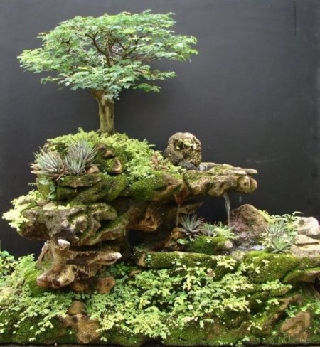 Penjing com Ficus retusa em pedra que modelei em concreto celular.