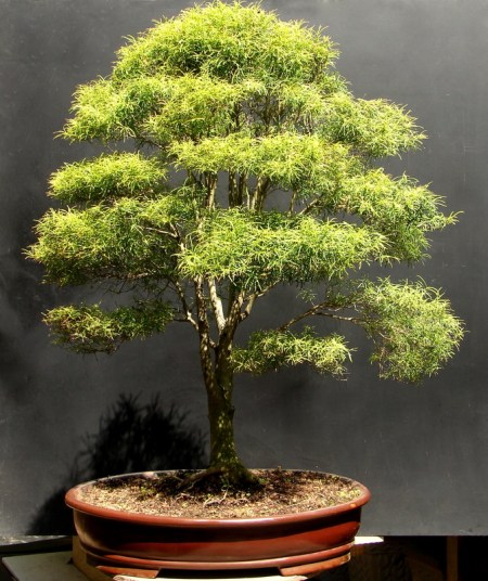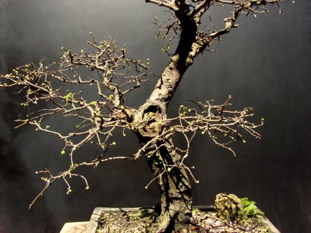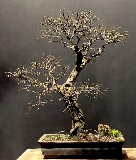 Costas, visão da parte de trás da árvore. O bonsai está em brotação após desfolhamento total em 20 de agosto de 2010.