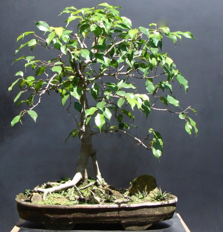 Ficus benjamina. Modelado a partir do trançamento de 5 plantas diferentes. Tempo para fusão total dos troncos 8 anos.